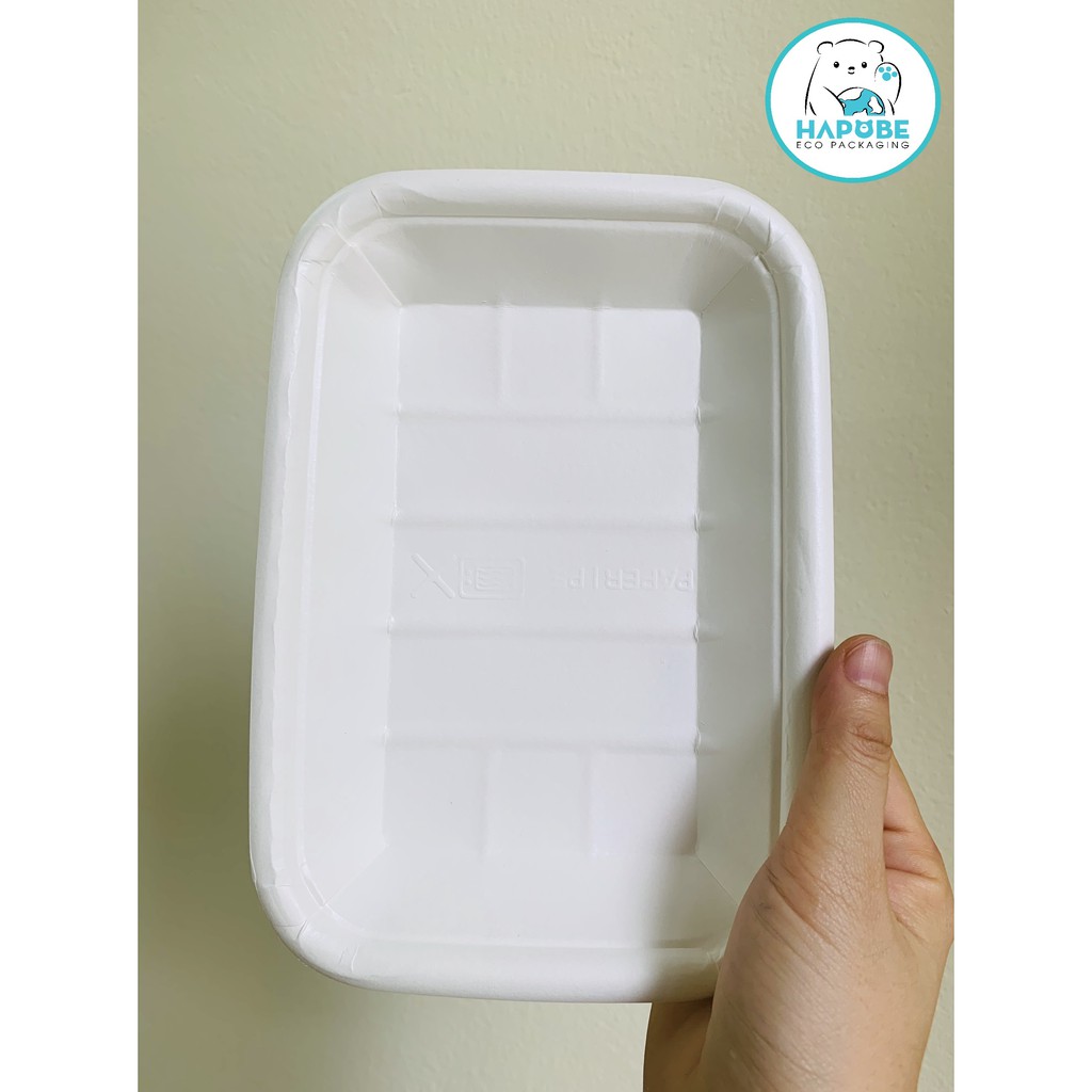 - Khay giấy được phủ 1 lớp nhựa PE đảm bảo đựng được các thực phẩm dầu mỡ, không bị ngấm nước.