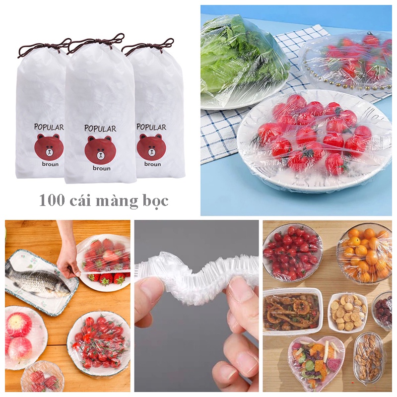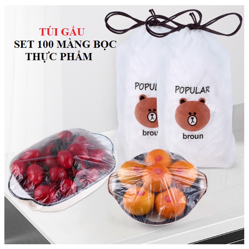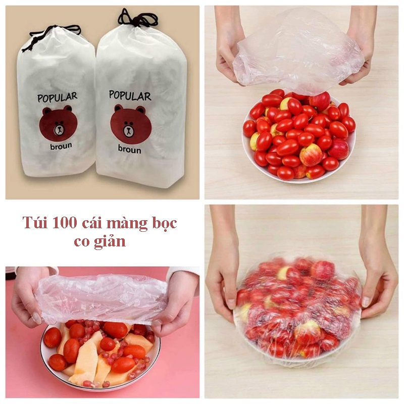 ComBo 100 màng bọc thực phẩm PE túi gấu có chun bọc đồ ăn co giãn tái sử dụng loại đủ