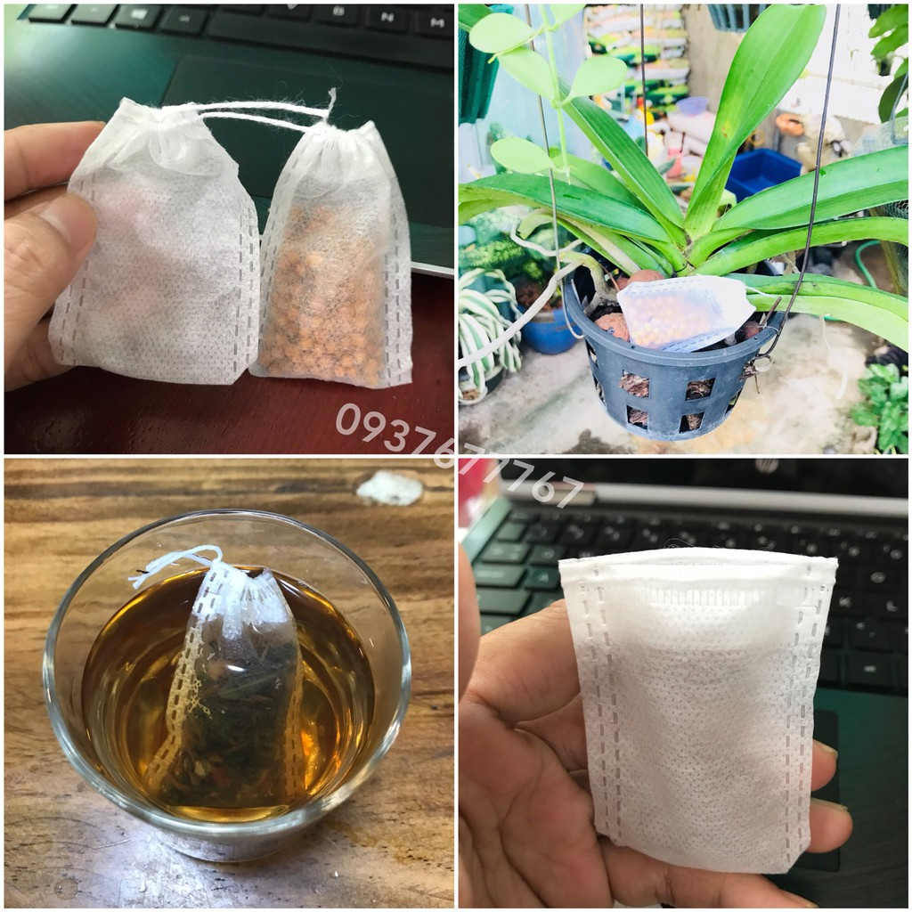 Túi lọc trà và làm túi đựng phân tan chậm, hoặc các loại phân nhuyễn không bị rơi ra ngoài rất tiện lợi vì có dây rút nhanh gọn các bạn có thể dùng bón gốc hoặc treo trên giò lan tiết kiệm thời gian và chi phí vì có thể tái sử dụng lại..