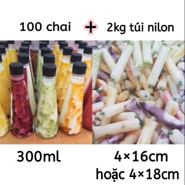 Combo 100chai Tam Giác 300ml và 2kg Túi Nilon dài 4×16cm