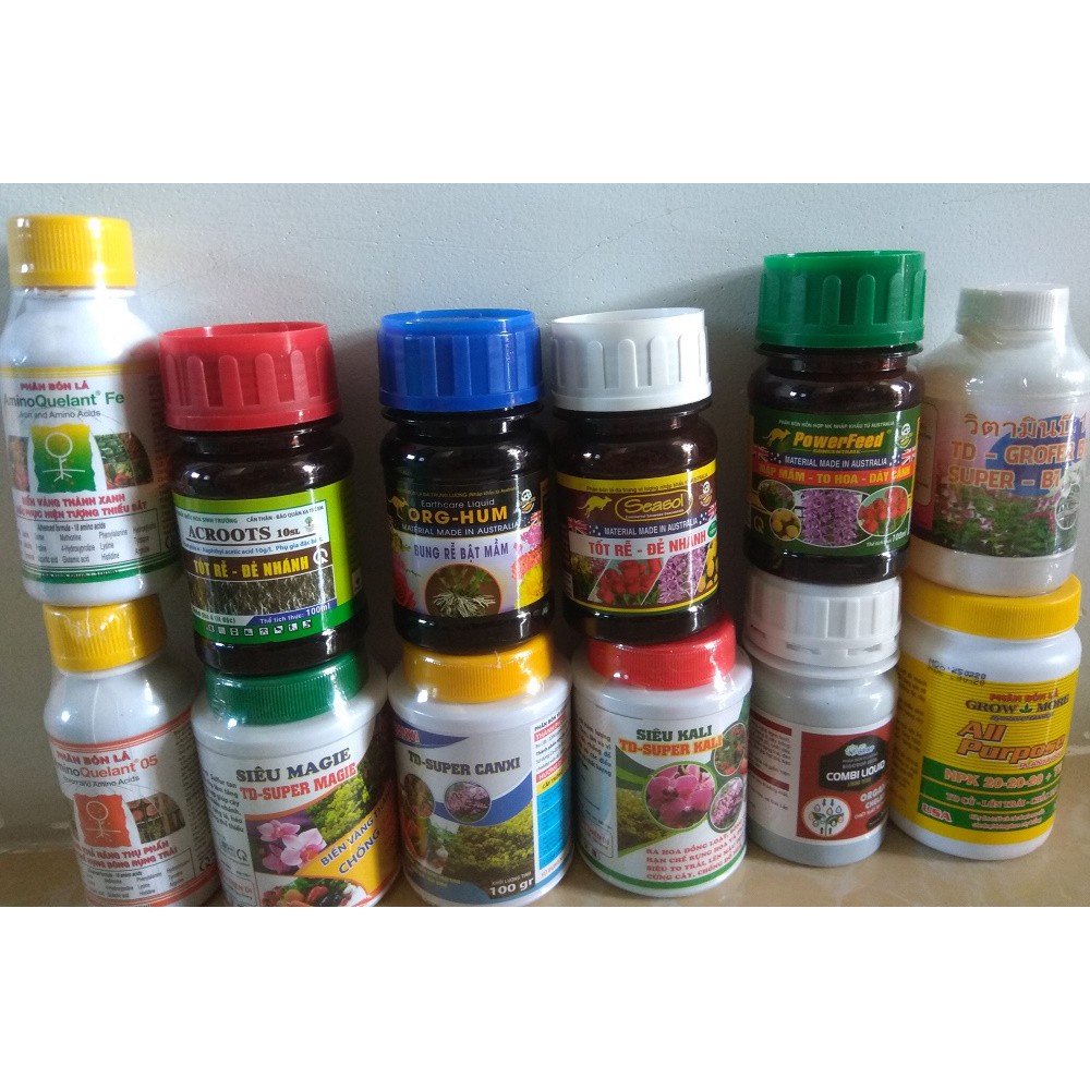 GỒM 12 LOẠI :Acroots, Org hum, Combi liquid, Siêu canxi, siêu kali, siêu Magie, Amino Fe, Amino Bo, NPK 20-20-20 , Vitamin B1 Grofer, Power feed, Seasol
