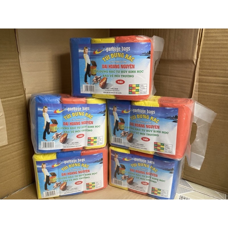 + Túi rác Đại màu 64 x 78cm (3 cuộn/kg): màu vàng, xanh dương, xanh lá cây và màu đỏ.
