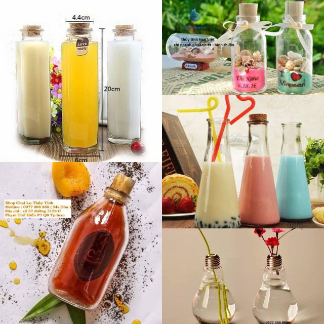 Combo 18 lọ thủy tinh trang trí các loại như hình , dung tích 100ml - 350ml :1. lọ 100ml nút gỗ : 5 cái x 5k = 25k