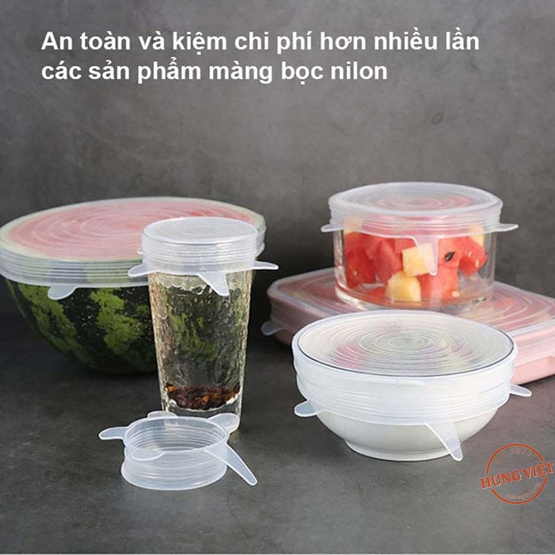 🍀🍀BỘ 6 MÀNG BỌC SILICON CO GIÃN - SỬ DỤNG NHIỀU LẦN - ĐỘ AN TOÀN CAOCăn bếp của các gia đình luôn có cả lố hộp nhựa rồi thuỷ tinh để đựng bảo quản thức ăn. Nhưng đôi lúc các bà nội trợ vẫn phải sử dụng màng bọc thực phẩm để bảo quản một số loại hoa quả, bát canh thừa hay khi hộp đựng bị mất nắp. Nếu cảm thấy ngán ngẩm với cả đống hộp đựng lộn xộn mất nắp và muốn hạn chế dùng bọc nilong độc hại thì Bộ 6 nắp đậy silicon co giãn chính là giải pháp mà bạn đang tìm kiếm.