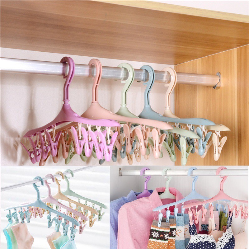 Đây là loại móc treo quần áo có 8 kẹp giúp bạn có thể treo nhiều đồ như tất, quần áo sơ sinh, trẻ con, đồ lót,…Ngoài ra ở phía đầu móc còn có chốt giúp bạn cố định móc trên dây không bị tác nhân bên ngoài làm rơi, rụng khỏi dây treo.