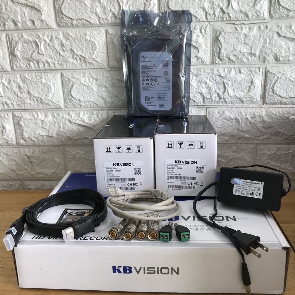 Combo 2 Camera 2.0MP FullHD kbvision + 1 Đầu ghi 7104SD6 H264+ HDD 500GB + Phụ kiện Chính Hãng
