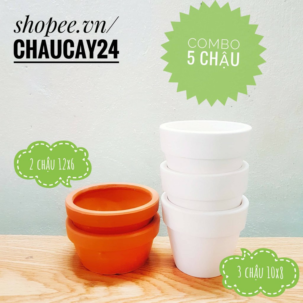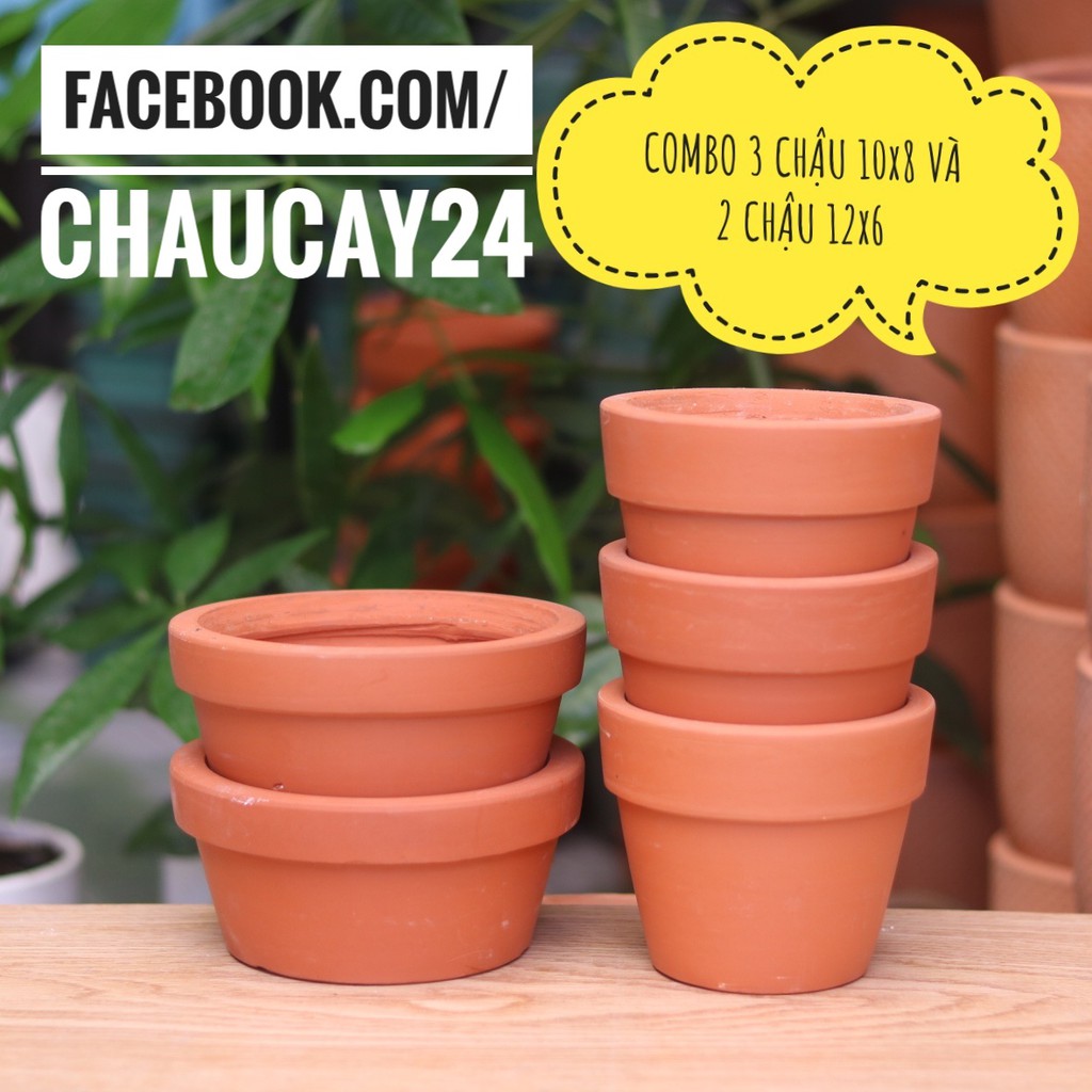 - COMBO bao gồm: 2 chậu đất nung 12x6 cm và 3 chậu đất nung 10x8 cm.
