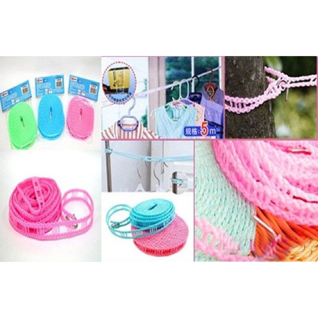 + Bộ sản phẩm bao gồm 01 dây phơi, có 3 màu mỗi dây dài 5 m, có thiết kế móc treo thuận tiện và các ô nhỏ cố định móc treo quần áo không bị xô.
