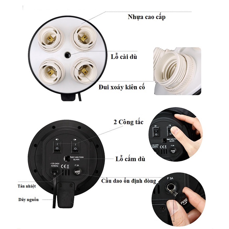 👉 Đui đèn 4 lỗ xoáy E27, 2 công tắc tắt bật, công suất tải: 200w