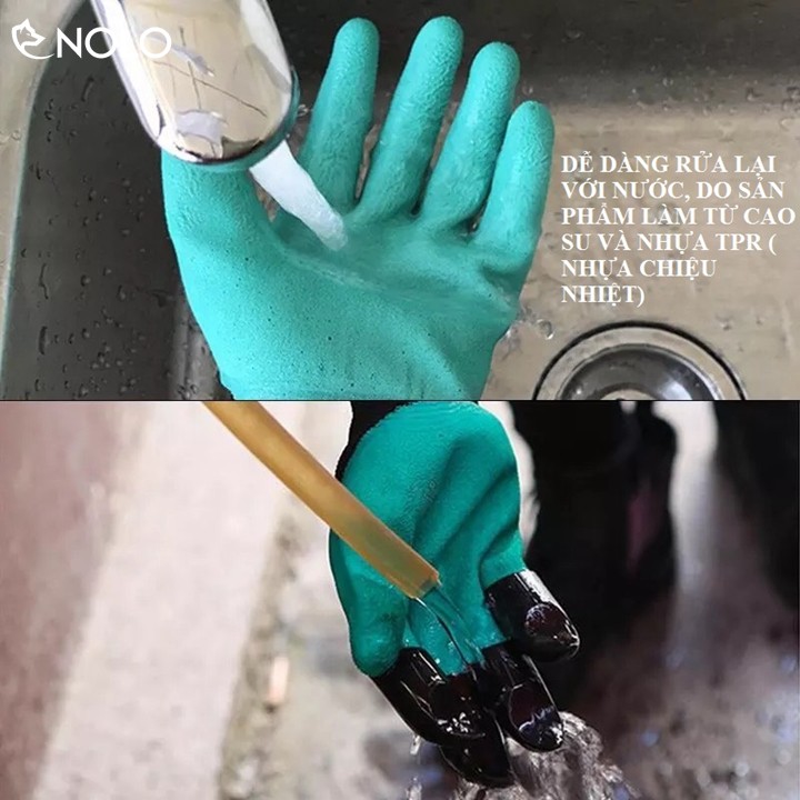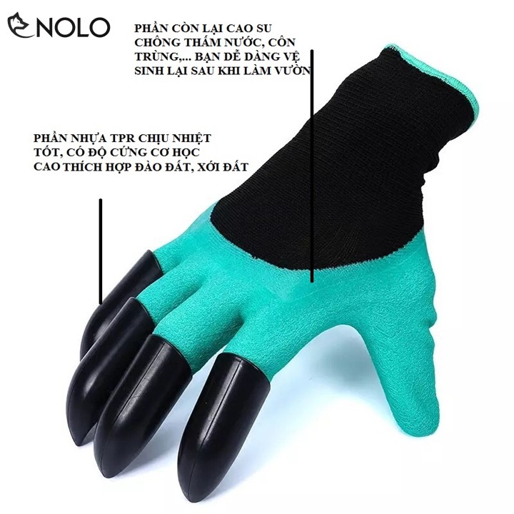 Sản phẩm được từ nhựa cao su cho khả năng chống nước tuyệt đối, còn có thể chống côn trùng, sâu bọ ở trong lớp đất. Ngoài ra, bên găng tay phải còn trang bị bộ móng làm từ nhựa TPR có độ cứng cơ học cao, bạn có thể dùng nó để cào đất, xới đất thay thế các dụng cụ làm vườn khác rất tiện lợi