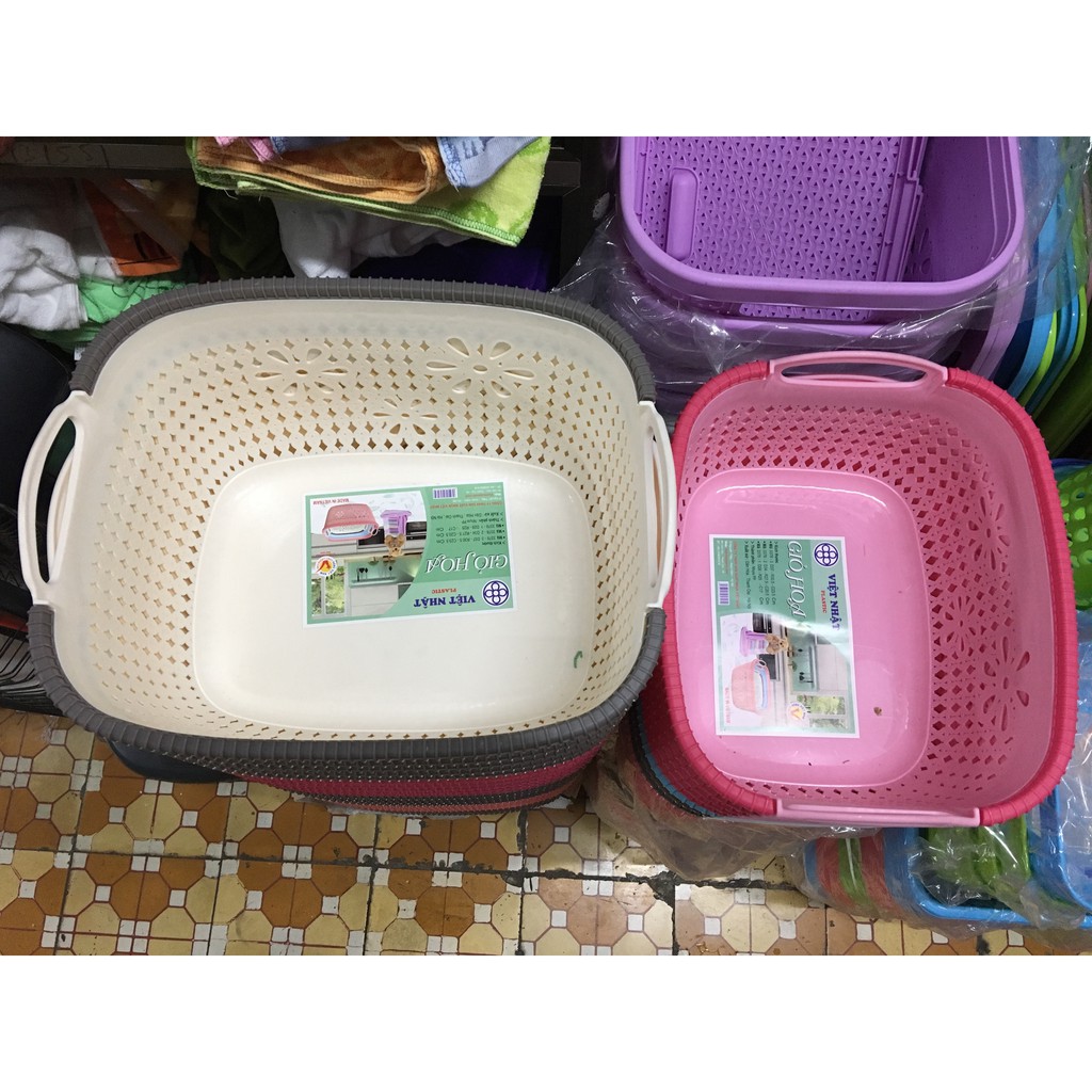 Giới thiệu Combo 2 giỏ nhựa hoa giả mây có quai xách size đại / Rổ nhựa Việt Nhật có quai xách size lớn