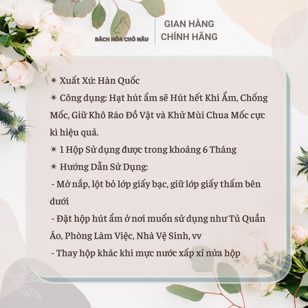 🌸 Công dụng: Hạt hút ẩm sẽ Hút hết Khí Ẩm, Chống Mốc, Giữ Khô Ráo Đồ Vật và Khử Mùi Chua Mốc cực kì hiệu quả.
