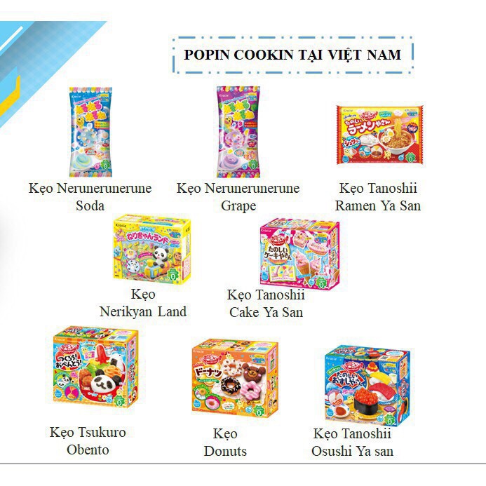 Popin Cookin là một sản phẩm của tập đoàn Kracie, nổi tiếng là một loại kẹo vừa ngon vừa vui vừa mang tính giáo dục cao, rất được lòng phụ huynh và các em nhỏ tầm 3-12 tuổi tại Nhật, cũng như nhiều bạn trẻ trong độ tuổi mộng mơ.