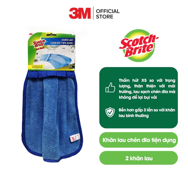 Giới thiệu Combo 2 Khăn lau chén đĩa Scotch Brite 3M đa năng, không trầy xước, thấm hút gấp 4 lần, không để lại bụi, độ bền cao