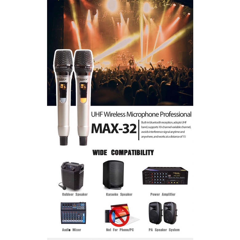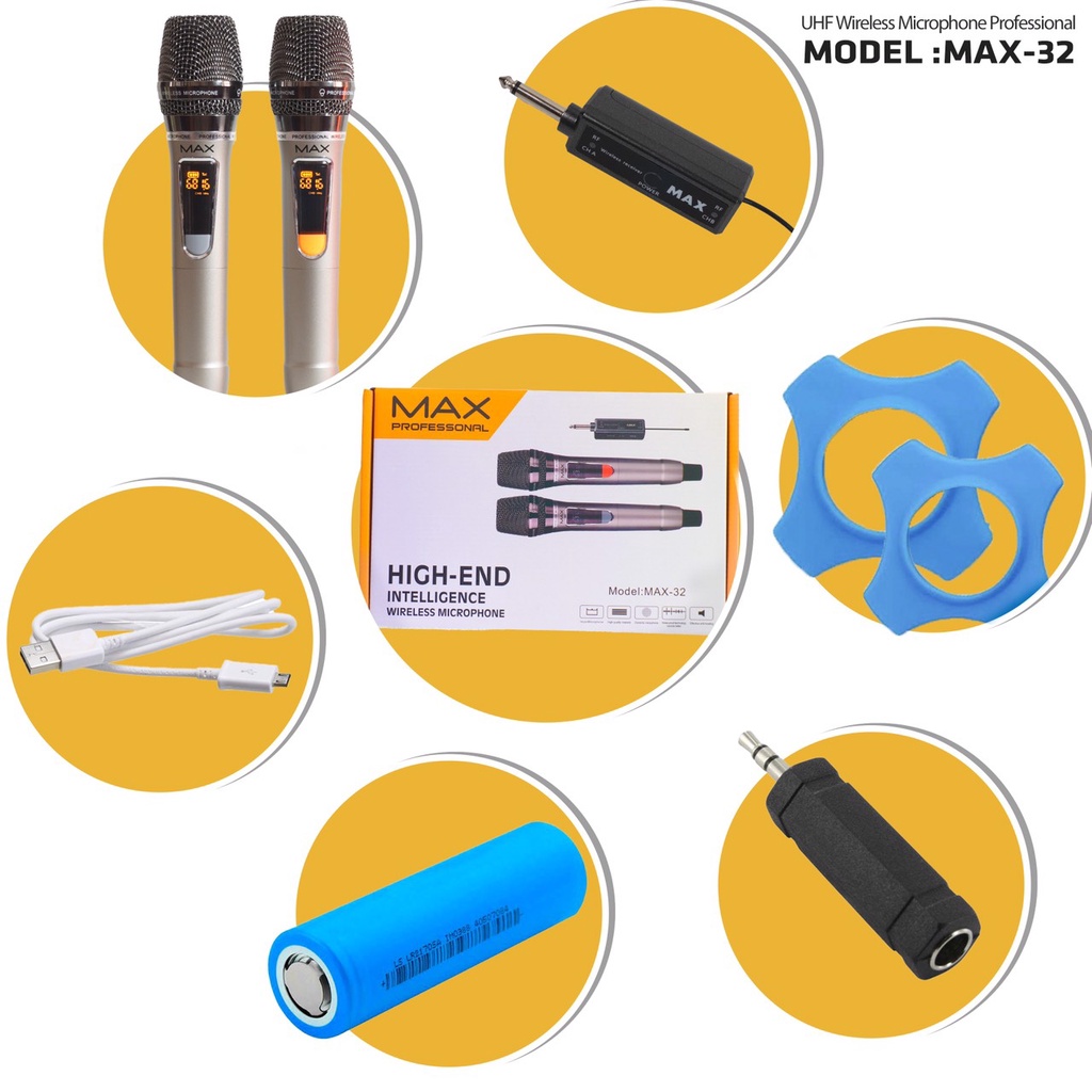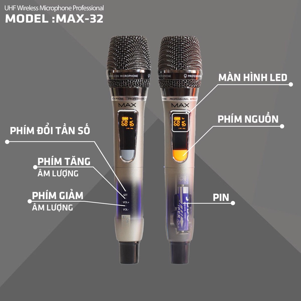 Combo 2 Micro không dây đa năng Max 32 - Màn hình LCD hiển thị tần số - phù hợp cho mọi thiết bị bắt sóng xa hút âm tốt