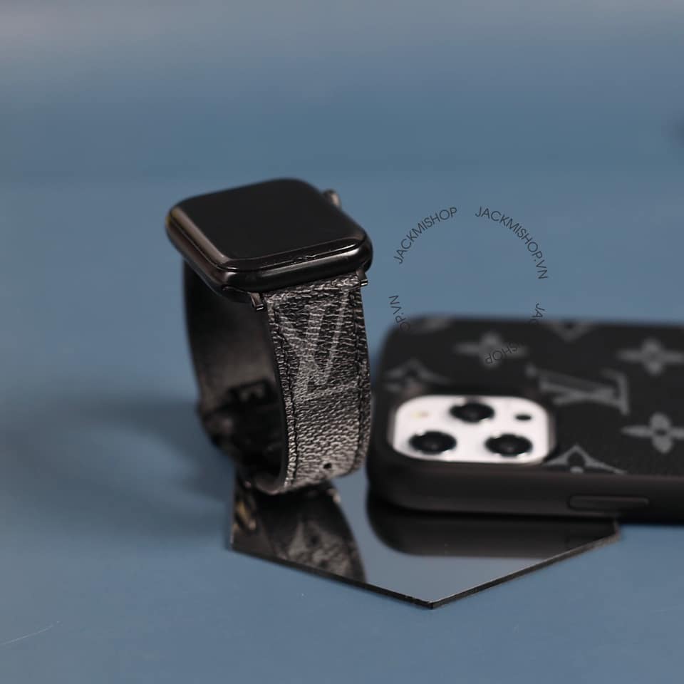 [COMBO 2 MÓN LV CHỮ ĐEN] DÂY DA LV HỌA TIẾT CHỮ CHO APPLE WATCH + ỐP LƯNG IPHONE (DÂY DA BẢO HÀNH 1 NĂM)