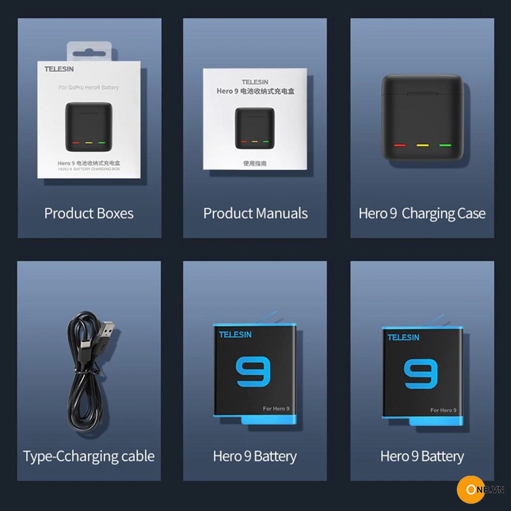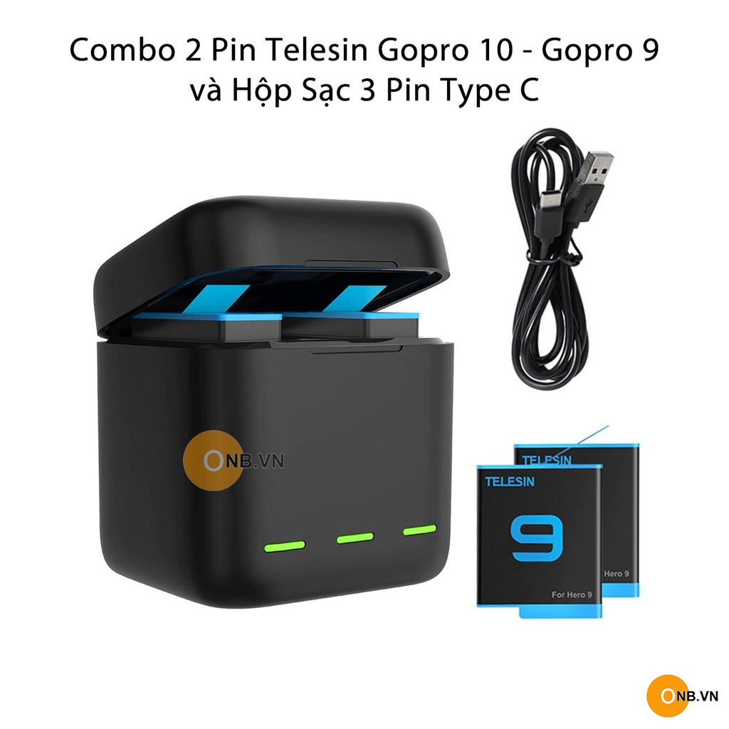 Combo 2 pin Gopro 9 Gopro 10 hiệu Telesin và hộp sạc Type C