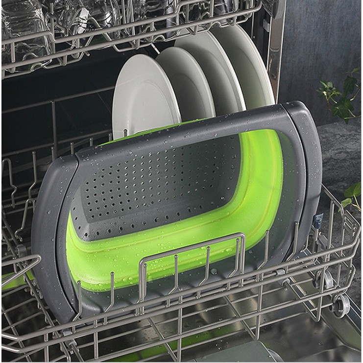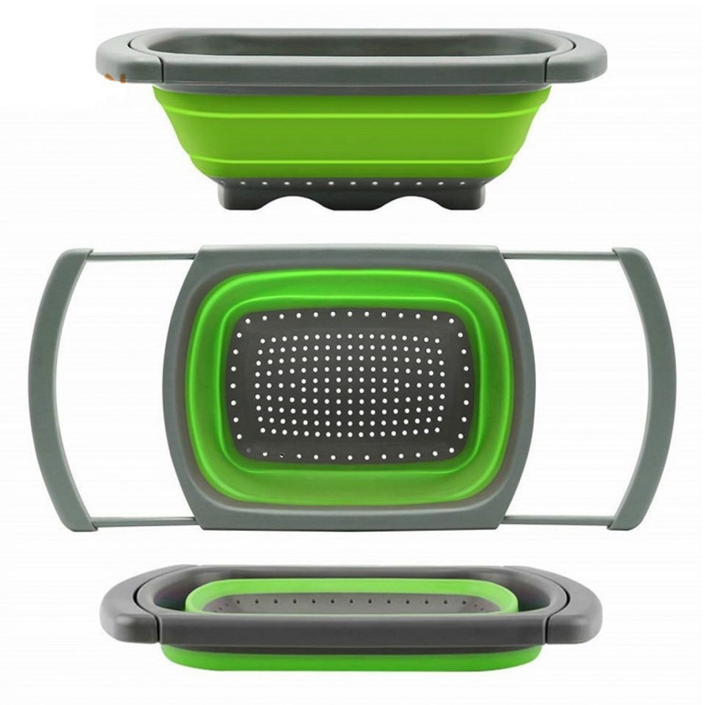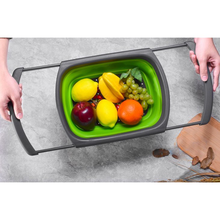 - Rổ lớn được thiết kế với tay cầm có thể kéo dài hoặc thu gọn, giúp rổ có thể đặt vừa vặn trên bồn rửa chén.