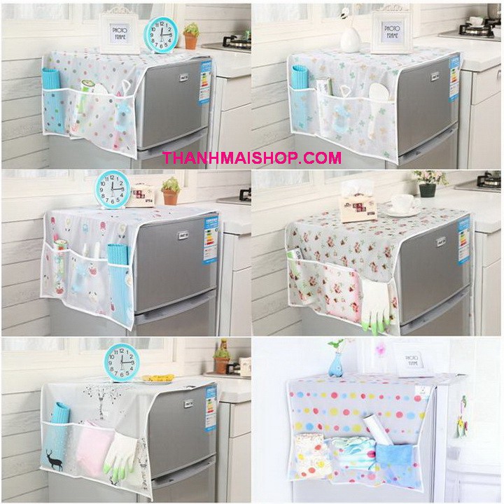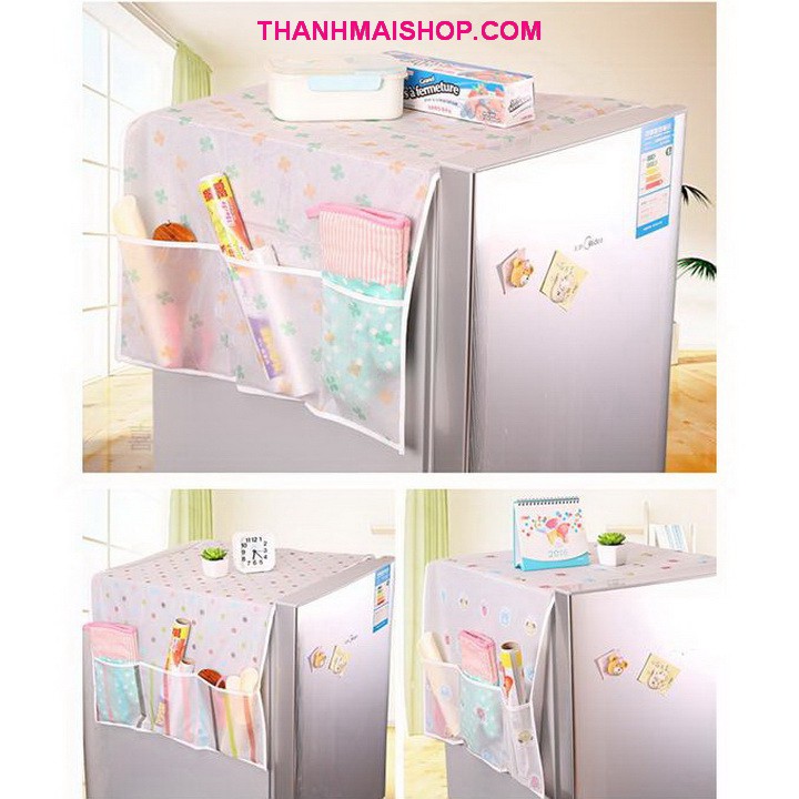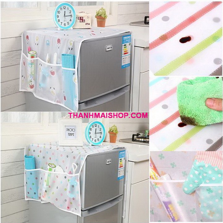 🍎 GD002x2 🍎 Combo 2 tấm phủ tủ lạnh PEVA trong suốt 2in1 tiện dụng, vừa chống bụi, chống thấm nước, vừa bảo vệ tủ lạnh, vừa là giá treo đồ thật gọn gàng, xinh xắn🔰 Tấm phủ tủ lạnh PEVA trong suốt 2in1 tiện dụng được làm từ chất liệu nhựa PEVA trong suốt cao cấp, chống thấm nước, với các họa tiết đẹp như chấm bi, cỏ 4 lá, hoa hồng, cúc xanh, động vật... đầy màu sắc, thiết kế khăn phủ vừa vặn lên phần nóc tủ lạnh, che được cả 2 bên hông tủ, hai bên có thêm 3 ngăn nhỏ đựng đồ, giúp bạn tiết kiệm không gian và tiện ích hơn cho việc nấu nướng, tô điểm cho tủ lạnh và phòng bếp thêm sinh động.