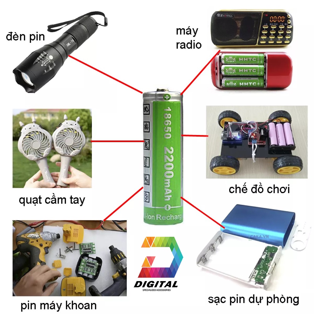 - Pin sạc Lithium (Li-ion) 18650 4.2V - 2200MAH được sử dụng phổ biến cho sản phẩm quạt siêu tốc cầm tay, loa, xe điện, đèn pin, thuốc lá điện tử, đèn led, đèn khẩn cấp, máy khoan vit, và các thiết bị điên tử khác.
