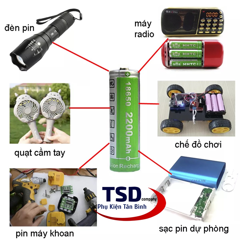 - Pin sạc Lithium (Li-ion) 18650 4.2V - 2200MAH được sử dụng phổ biến cho sản phẩm quạt siêu tốc cầm tay, loa, xe điện, đèn pin, thuốc lá điện tử, đèn led, đèn khẩn cấp, máy khoan vit, và các thiết bị điên tử khác.