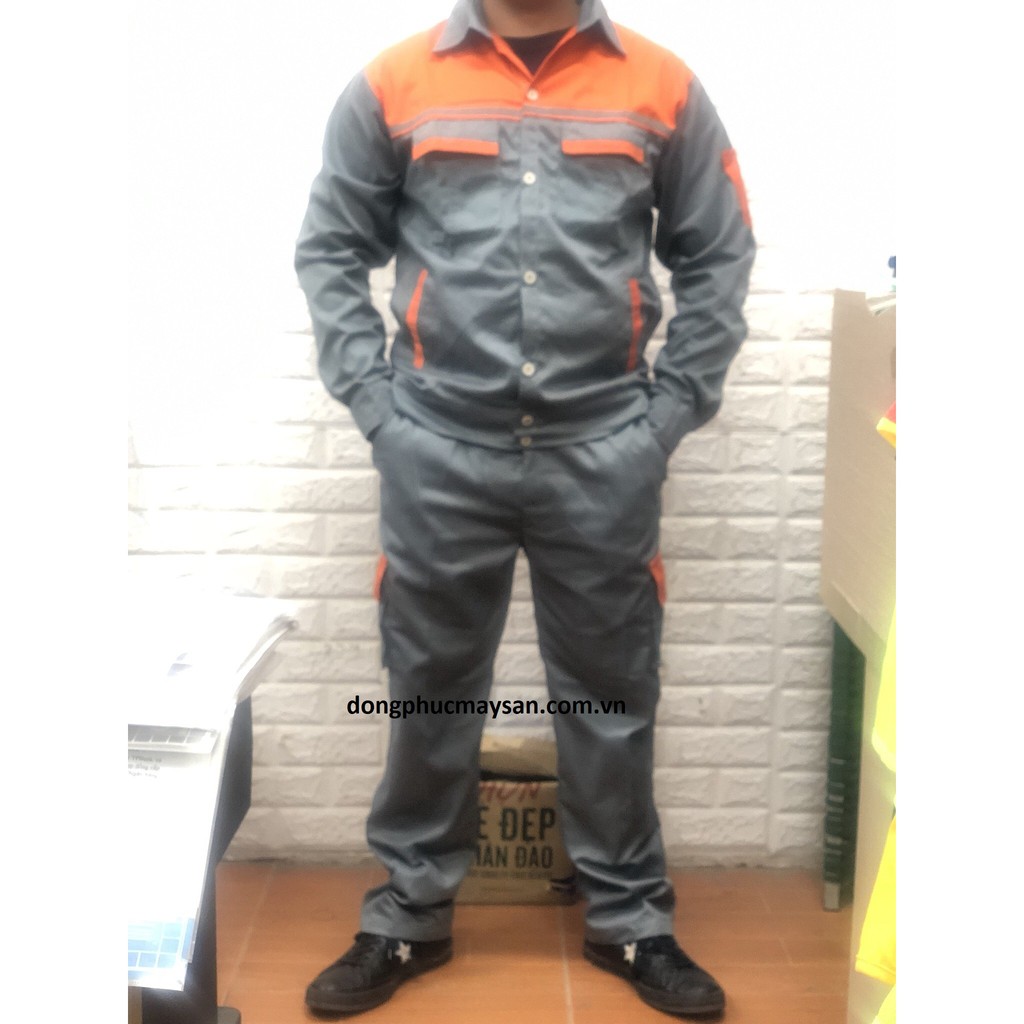 Vải: Kaki Việt Nam dày.Kiểu dang áo: Màu ghi pha cam có kèm phản quang