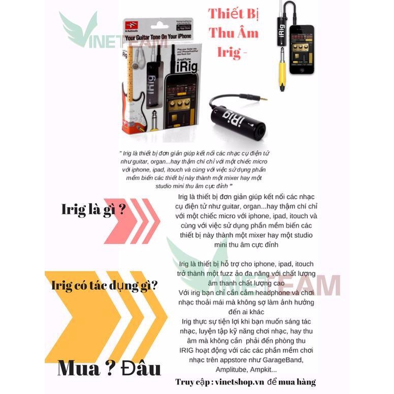 IRIG AMPLITUBEdùng đểkết nối đàn guitar với máy tính, điện thoại hay loa để thu âm nhạc cụ hay chơi nhạc trực tiếp với các hiệu ứng âm thanh từ ứng dụngAmpliTube.