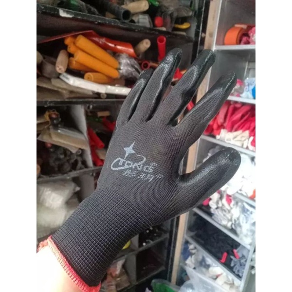 găng tay lao động không thể thiếu khi làm việcgăng tay phủ sơn màu đen vừa đảm bảo dày dặn bảo vệ tốt bàn tay, vừa có mặt lưng thoáng khí