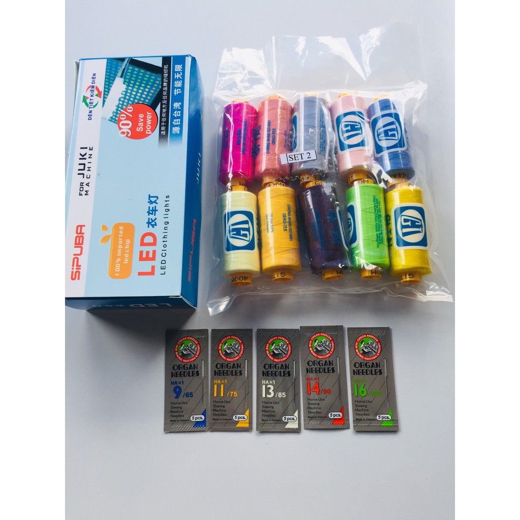 Giới thiệu COMBO 3 10 cuộn chỉ GITAI set 2 5 vỉ kim máy may gia đình số 9.11.13.14. 16 và 1 đèn led 30 bóng gắn máy may