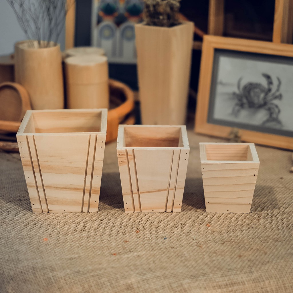 Bộ 3 chậu gỗ trồng sen đá- Được làm từ gỗ thông nhập có vân gỗ tự nhiên mộc mạc xinh xắn