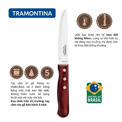 Combo 3 Dao Ăn Bò Bít Tết Cán Gỗ Đỏ Tramontina Jumbo Polywood 12.2cm