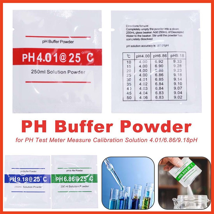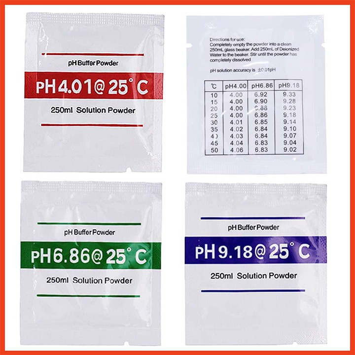 Được sử dụng để hiệu chuẩn axit PH và bút thử kiềm, mỗi gói có thể được chuẩn bị với dung dịch chuẩn 250ML