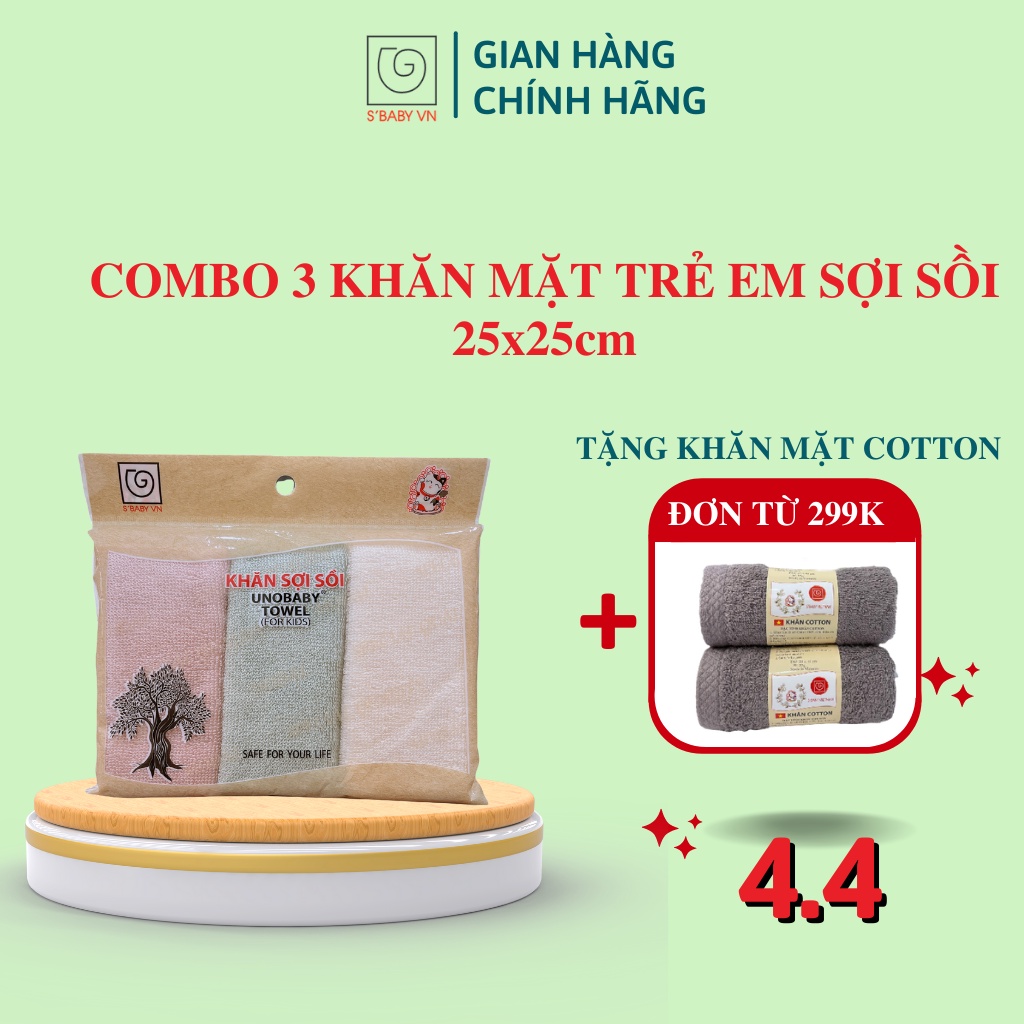 Combo 3 Khăn Mặt Trẻ Em Sợi Sồi S'BABY 25x25cm Khả Năng Kháng Khuẩn Cao, An Toàn Với Làn Da - 8936137960417 (Túi)🌸 THÔNG TIN SẢN PHẨM