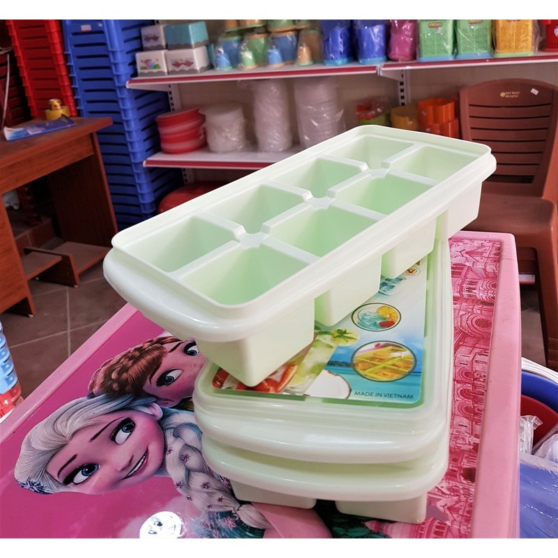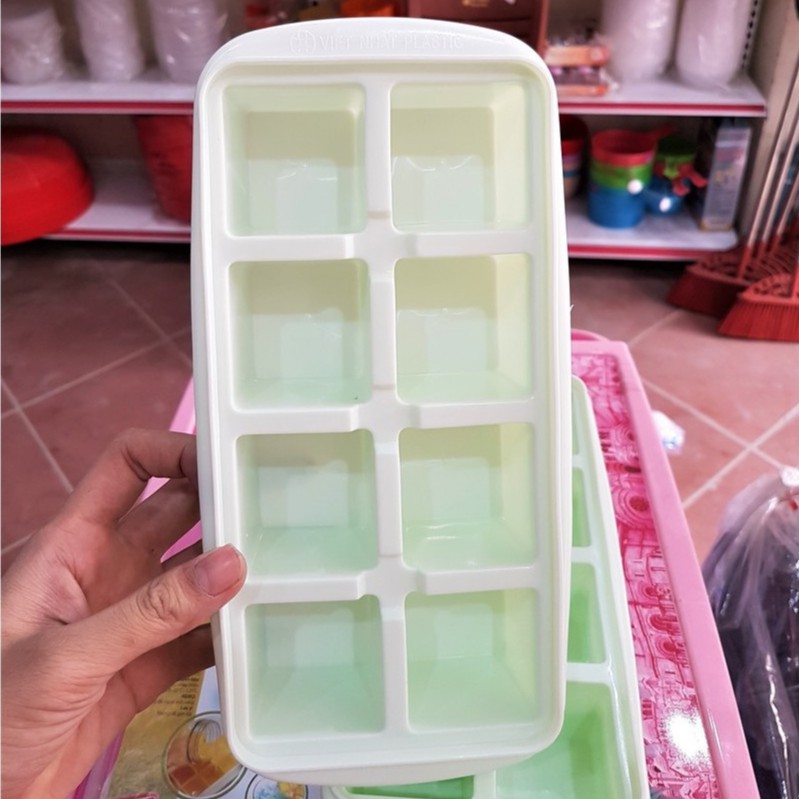 Khay đá 8 viên có nắp đậy hãng Việt Nhật, chất liệu nhựa cao cấp đảm bảo an toàn vệ sinh, thiết kế có nắp đậy kín.Ngoài chức năng làm đá các mẹ có thể dùng làm hộp chia đồ ăn dặm cho các bé rất tiện lợi và đảm bảo vệ sinh.