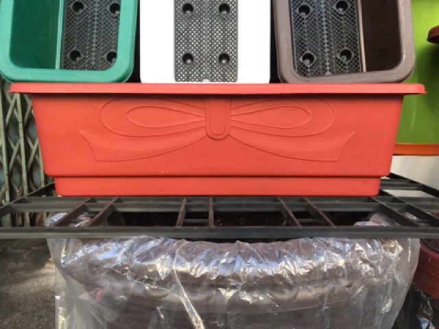 Khay nhựa dài dùng để trồng rau sạch ở nhà.Nhựa tốt, dày dặn, có vành, dễ di chuyển và vệ sinh. Thân chậu có khắc hoa văn Nơ nổi. Đơn giản, đẹp. Bên trong có lót thoát nước, giữ đất không bị trôi