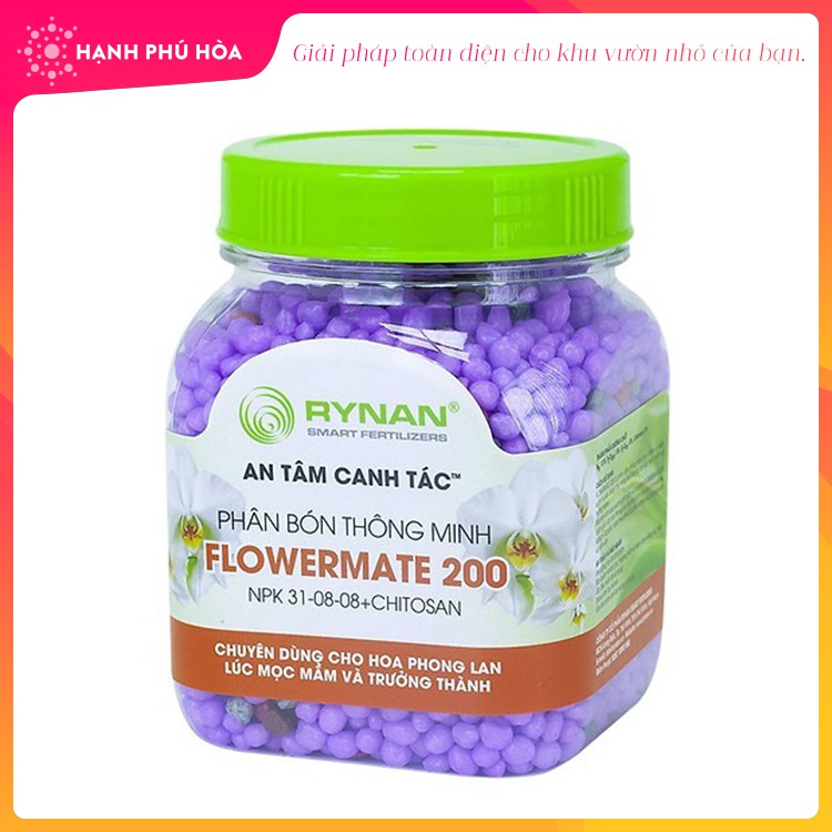 - RYNAN® FLOWERMATE 200 là dòng sản phẩm phân bón thông minh tan chậm có kiểm soát chuyên dùng cho hoa phong lan. Cung cấp đầy đủ dưỡng chất cần thiết ở giai đoạn cây con mọc mầm và trưởng thành, thời gian cung cấp dưỡng chất lên đến 120 ngày. Giúp cây sinh trưởng khỏe mạnh, tăng sức đề kháng, hạn chế nấm bệnh, phục hồi cây nhanh, phát triển thân lá.