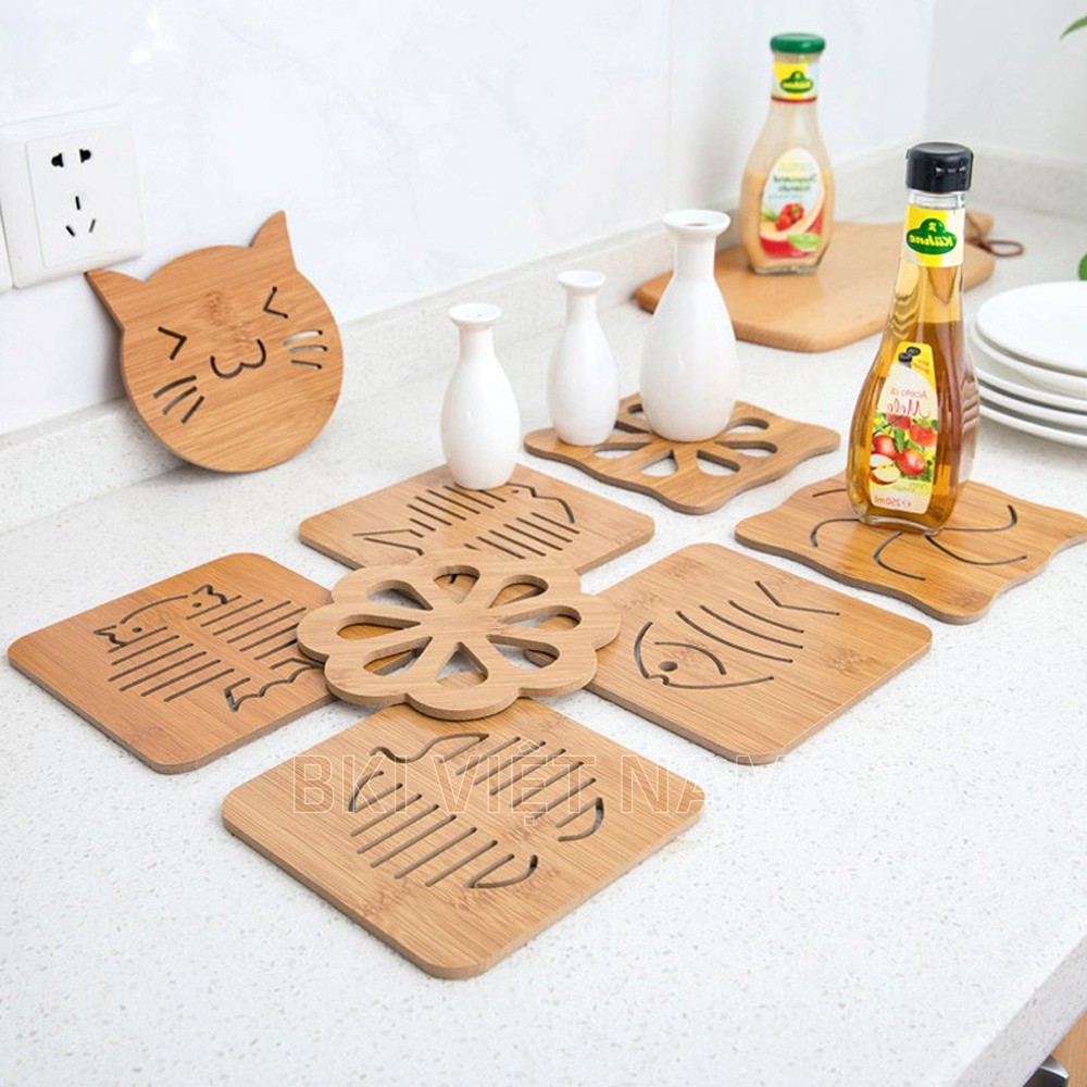 Đế lót nồi vốn là vật dụng không thể thiếu của các chị em trong gian bếp. Đế lót nồi bằng gỗ tiện dụng bền chắc cho thời gian sử dụng lâu dài. Bạn có thể dùng rế lót nồi cơm, canh, kho… để không bị bỏng tay khi bưng nồi từ bếp đến bàn ăn. Với kích thước vuông, gọn, được khắc các họa tiết ngộ nghĩnh đẹp mắt, đế lót nồi bằng gỗ cũng là 1 vật dụng trang trí giúp cho bàn ăn của gia đình bạn thêm sinh động và lạ mắt.Đặc điểm nổi bật của đế lót nồi bằng gỗ :