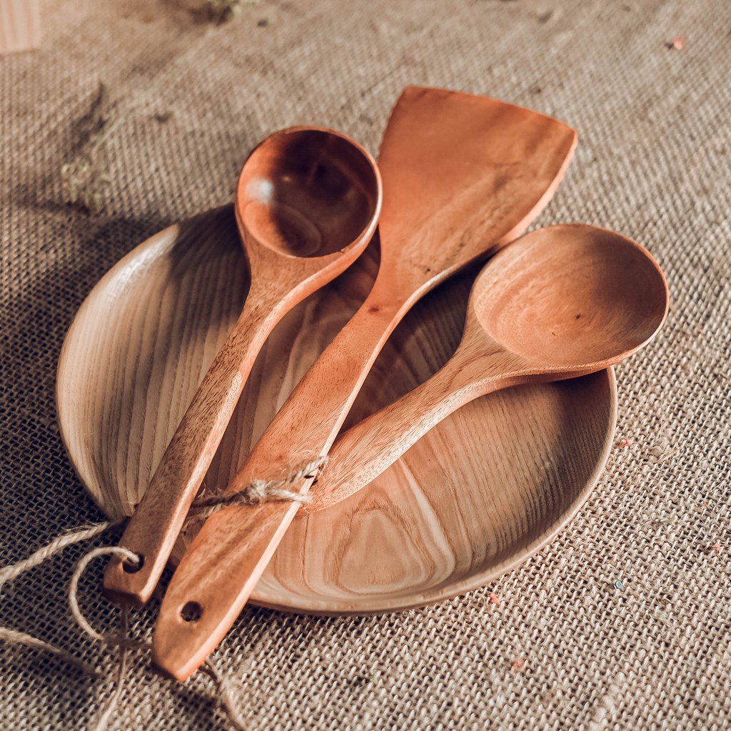 Combo: 1 sạn xào gỗ/ 1 vá canh/ 1 vá cơmBộ dụng cụ nấu ăn được làm từ gỗ tự nhiên, sử dụng bền và àn toàn
