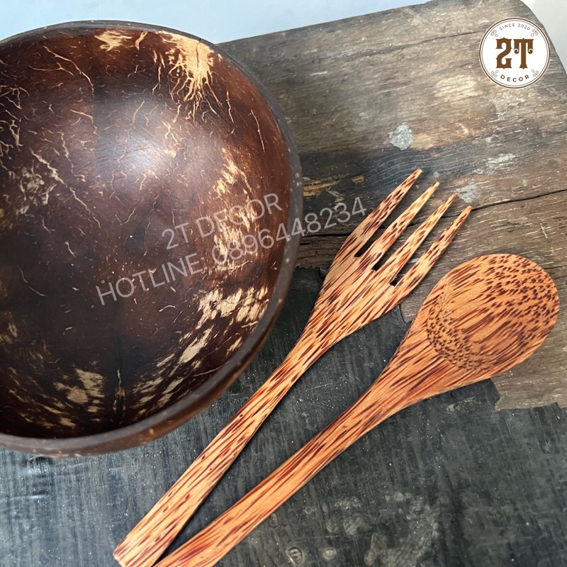 Giới thiệu Combo 3 món bát gáo dừa +muỗng+ nĩa gỗ dừa dùng ăn trái cây, salad ngũ cốc, decor chụp ảnh