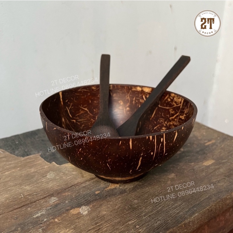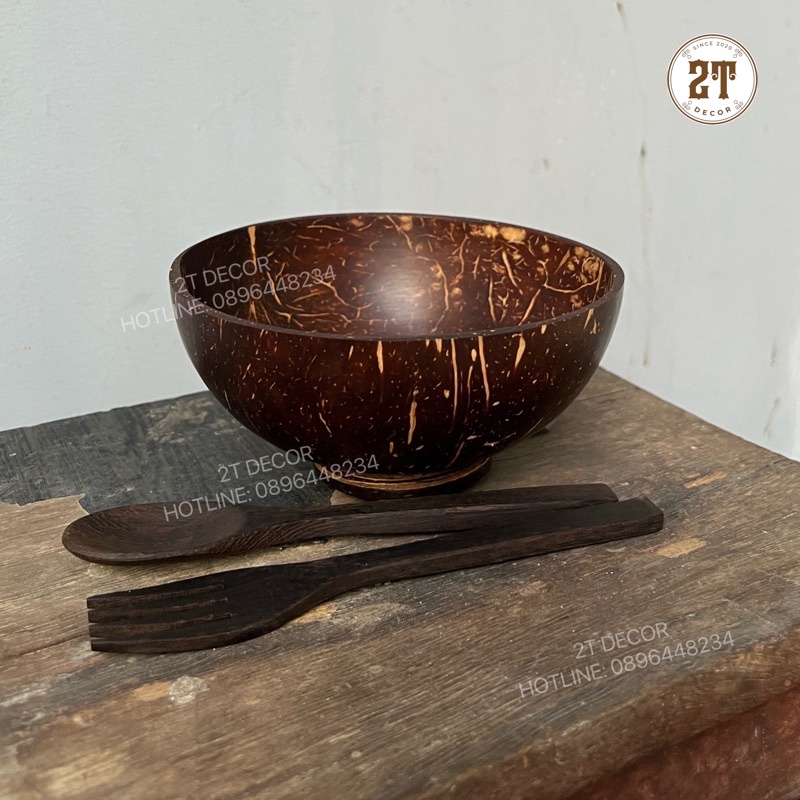 Nhà cửa & Đời sống > Bộ đồ bàn ăn > Tô || combo 3 món : bát gáo dừa tròn có đế mài đẹp+ muỗng + nĩa mun , dùng ăn ngũ cốc, trái cây, trang trí bàn ăn, decorCòn hàng