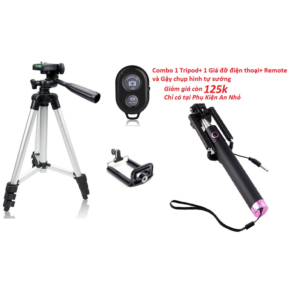 Combo 3 món chân đế chụp hình Tripod TF-3110+kẹp điện thoại+remote bluetooth tặng 1 Gậy tự sướng