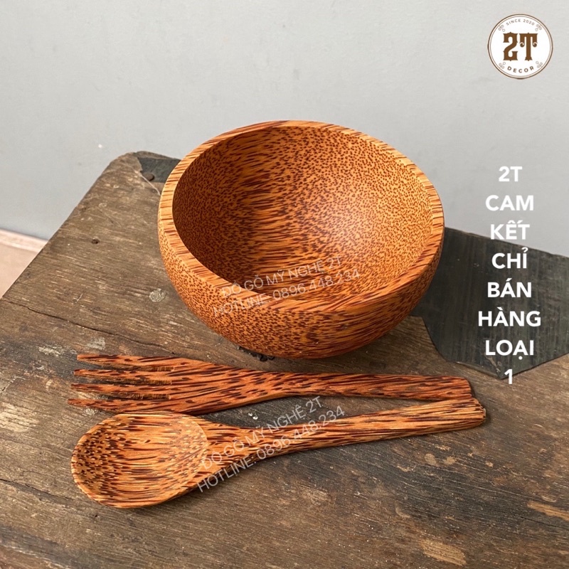 Combo 3 món: chén gỗ dừa dk 11cm +muỗng 16cm+ nĩa 16cm dùng trong ăn uống, trang trí bàn tiệc , hàng loại 1 xuất khẩu