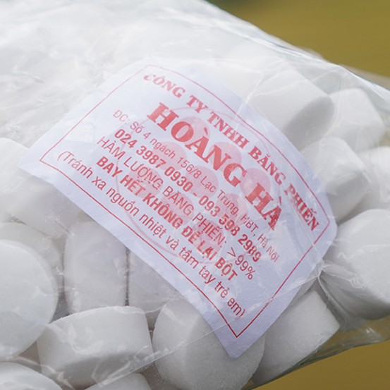 Băng phiến (long não) xua đuổi côn trùng - hàm lượng nguyên chất > 99.5%, bay hơi 100% không để lại bột1. Băng phiến nguyên chất > 99.5%. Mùi nồng, hắc - Trọng lượng: 1kg/túi