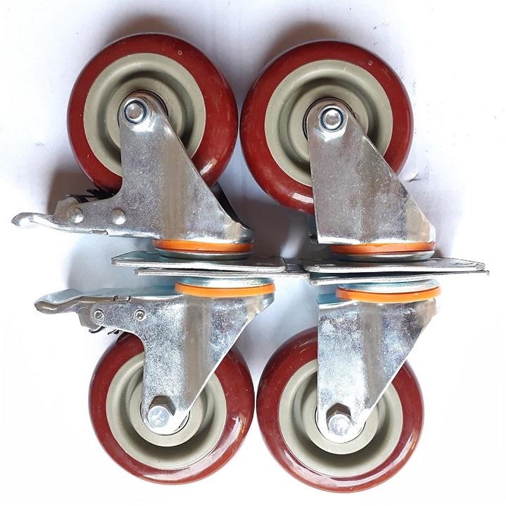 ----Combo 4 bánh xe đẩy hàng chịu lực cao+ Gồm 2 bánh xoay và 2 bánh xoay có khóa - Đường kính bánh xe d=7cm ,10 cm - Kich thước mặt bích, chiều cao vui lòng xem trên hình - Tải trọng một bộ / 4 bánh xe 180~220 kg. - Giá thành rẻ hình thức đẹp phù hợp với thẩm mĩ của khách hàng. - Di chuyển đa mặt sàn - Chất liệu nhựa PU cao cấp có ma sát tốt,chống mài mòn, khung théo không rỉ - Ổ bi trơn tru đã có sẵn mỡ bôi trơn, đai ốc chắc chắn - Màu đỏ mận Bánh xe đẩy lăn nhẹ nhàng, đỡ tốn sức. Bánh xe có lốp bằng PU màu đỏ nên có thể chịu được xăng, dầu mỡ, lốp PU có độ đàn hồi nhẹ nên di chuyển cũng ít gây tiếng ồn