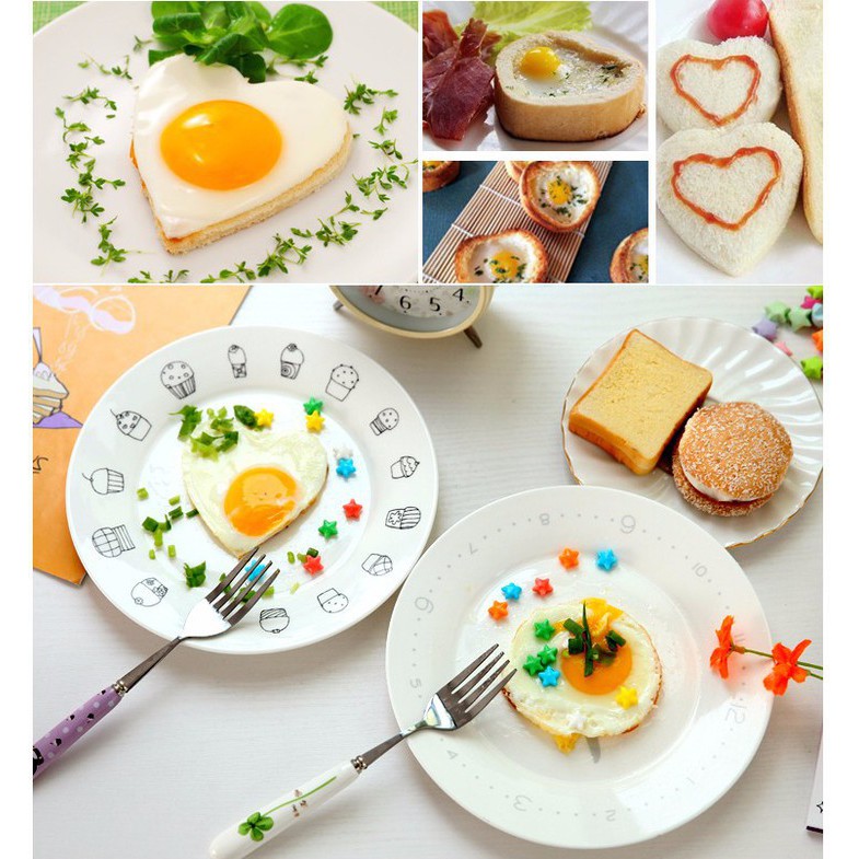 Với bộ dụng cụ này, món trứng ốp của bạn sẽ tuyệt đẹp. Có hình trái tim, hình tròn, hình bông hoa, hình ngôi sao. Sử dụng rất đơn giản, bạn chỉ cần cho khuôn lên chảo, cho dầu vào, rồi đập trứng vô là xong. Cùng 1 chiếc chảo, bạn có thể ốp được 4 quả trứng cùng lúc. Thật tiện phải ko nào?!
