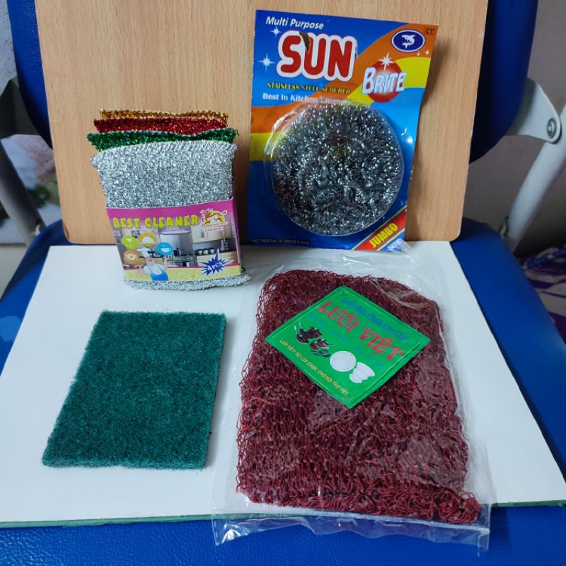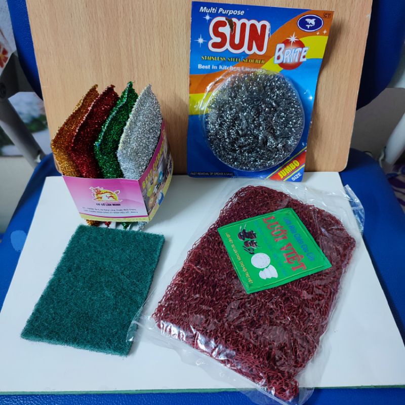 Nhà cửa & Đời sống > Dụng cụ chăm sóc nhà cửa > Miếng bọt biển, miếng chà vệ sinh || Combo 4 miếng cước rửa chén,rửa bát siêu sạch ( cước kim tuyến+ cước lưới+ cước sắt chùi xoong+ cước xanh).Còn hàng