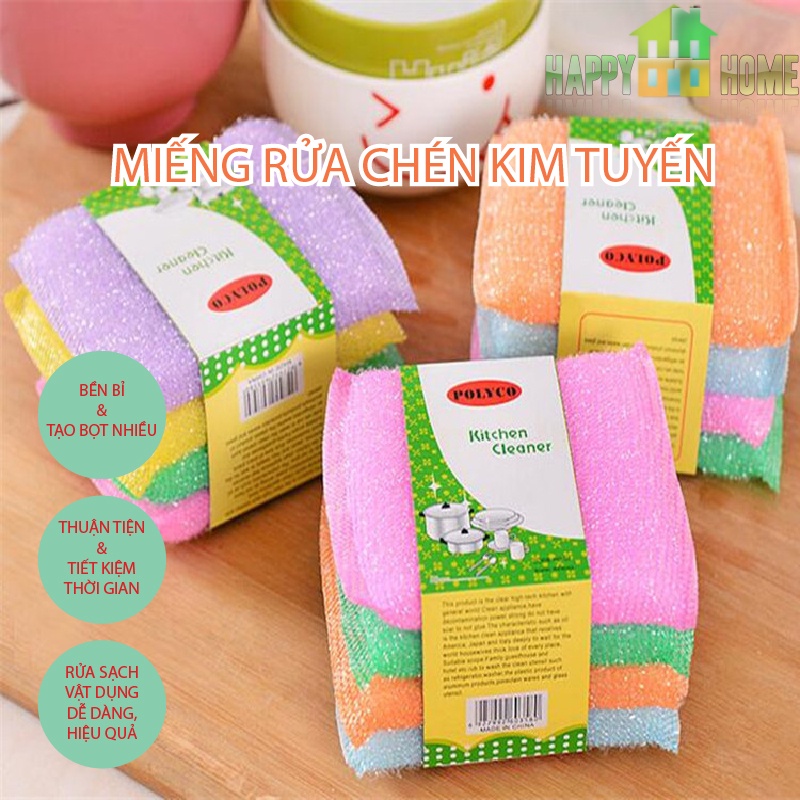 Combo 4 miếng rửa chén kim tuyếnMiếng rửa chén kim tuyến được sản xuất trên dây chuyền hiện đại mang chất lượng đảm bảo an toàn cho người sử dụng. Sản phẩm có độ bền, sử dụng dễ dàng giúp lấy sạch các vết bẩn ở các loại ly tách, chén bát và các đồ vật trong gia đình. So với miếng rửa chén 3M của Mỹ, miếng rửa chén kim tuyến có giá thành rẻ và dễ sử dụng hơn.