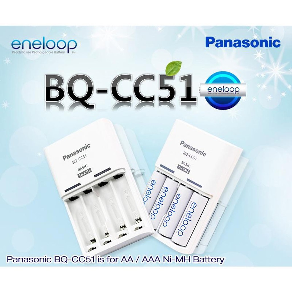 -Sạc Panasonic BQ-CC51 dòng Basic, cho độ bền lâu dài và an toàn nhất trong quá trình sạc, thời gian sạc đầy là 10h (đối với pin eneloop trắng) và 12h (đối với pin eneloop Pro Đen)