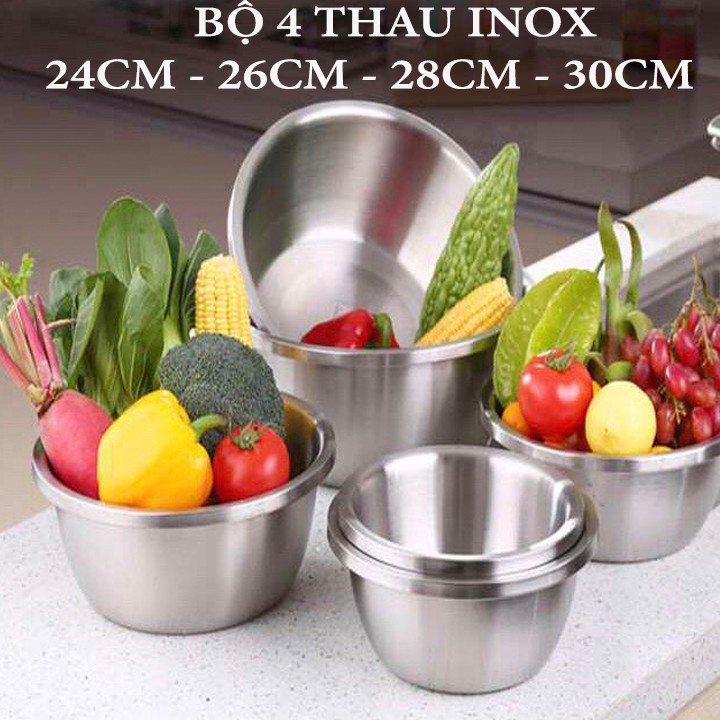Nhà cửa & Đời sống > Dụng cụ chăm sóc nhà cửa > Chậu, xô & gáo nước || Combo 4 thau inox cao cấp size 24 cm - 26 cm - 28 cm - 30 cm rửa rau, thau trộn salad an toànCòn hàng