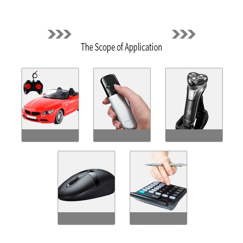 - Ứng dụng: pin cho đồ chơi, pin cho điều khiển, pin cho đồng hồ, pin đồ chơi điều khiển, pin cho micro...